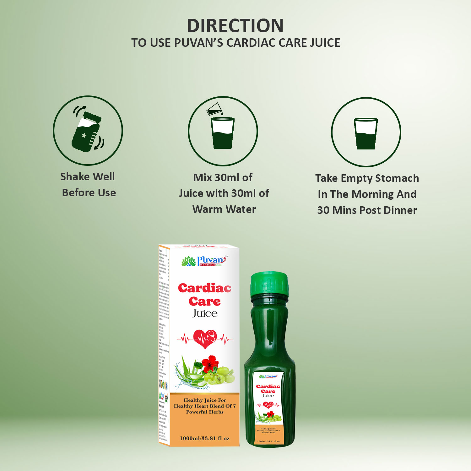 Puvan Herbals Cardiac Care Juice is a natural blend of 7 powerful herbs including Arjuna, Amla, Aloe Vera, Jatamansi, Sarpagandha, Hibiscus, and Lauki. Formulated to support heart health, control cholesterol, manage blood pressure, reduce stress, and boost immunity – 100% natural with no added sugar, color, or artificial flavors.