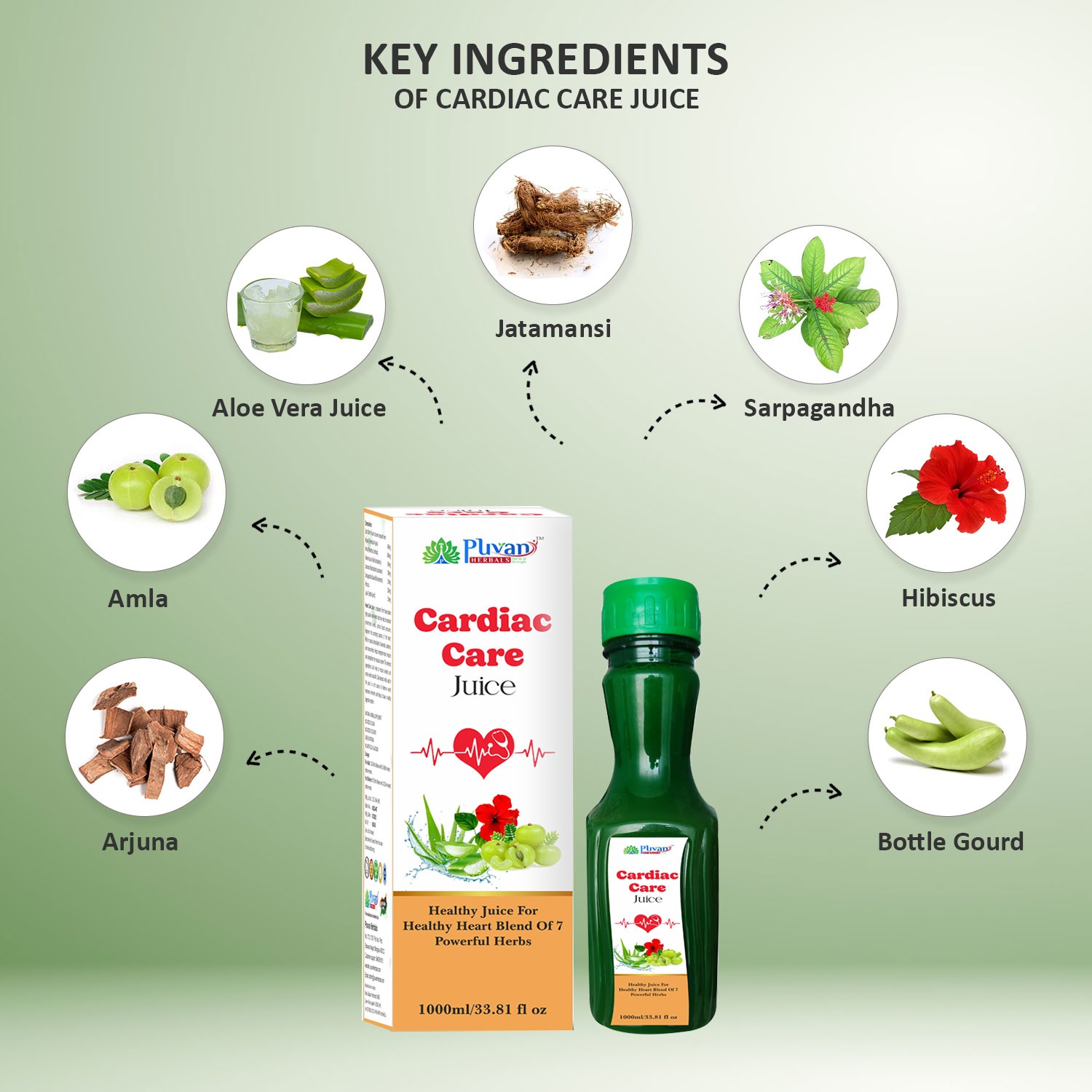 Puvan Herbals Cardiac Care Juice is a 100% natural heart care juice made with powerful Ayurvedic herbs such as Arjuna, Amla, Aloe Vera, Jatamansi, Sarpagandha, Hibiscus, and Lauki.