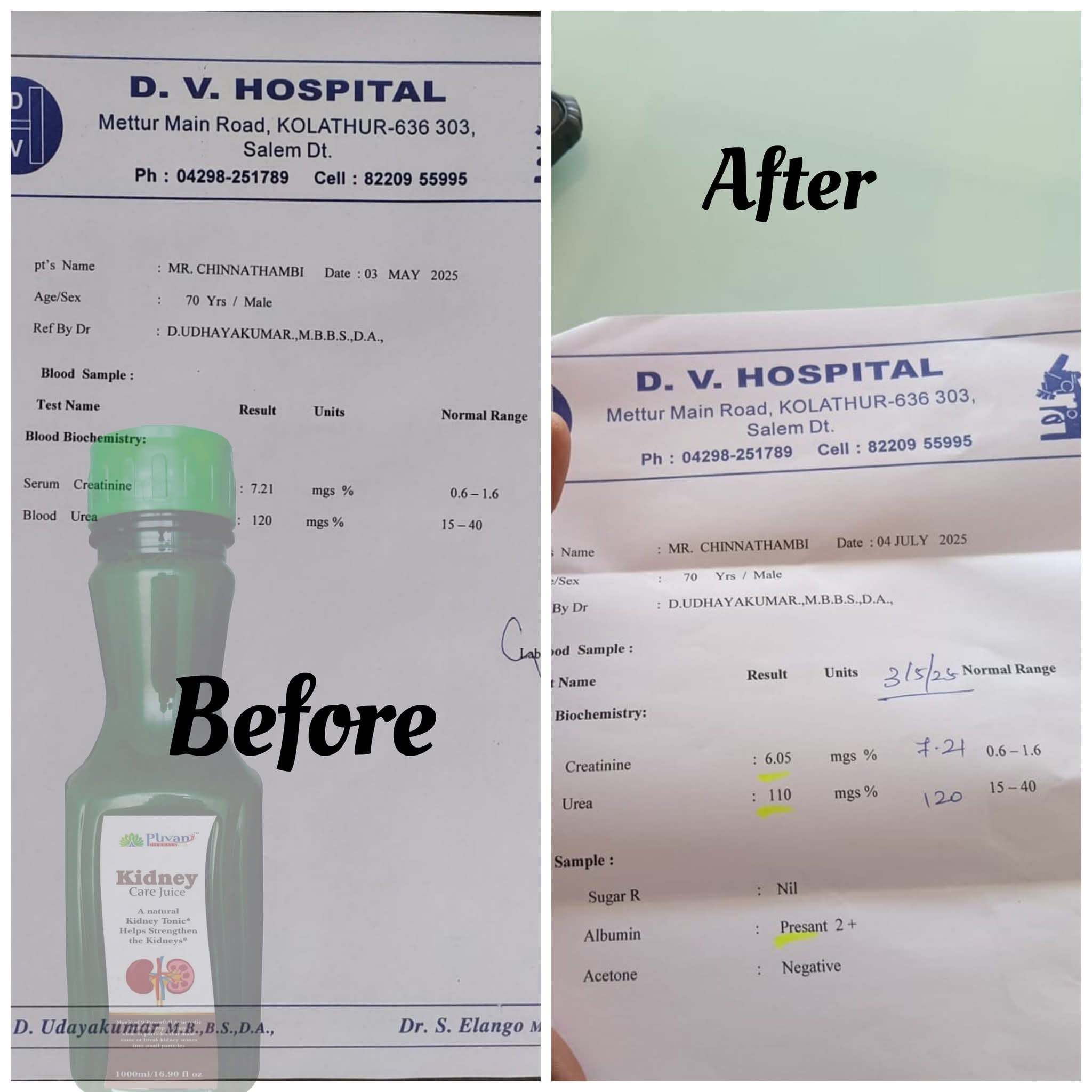 After taking this juice for 2 months my creatinine level decreased from 2.8 to 1.2 thank you puvan herbals