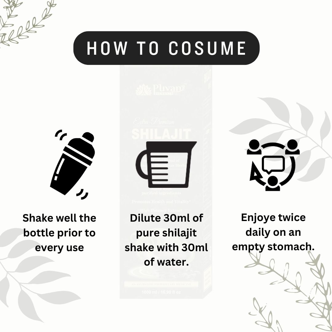 Mix 30 ml of Shilajit Shake with 30–100 ml water and consume twice daily, or as directed by a healthcare professional.
