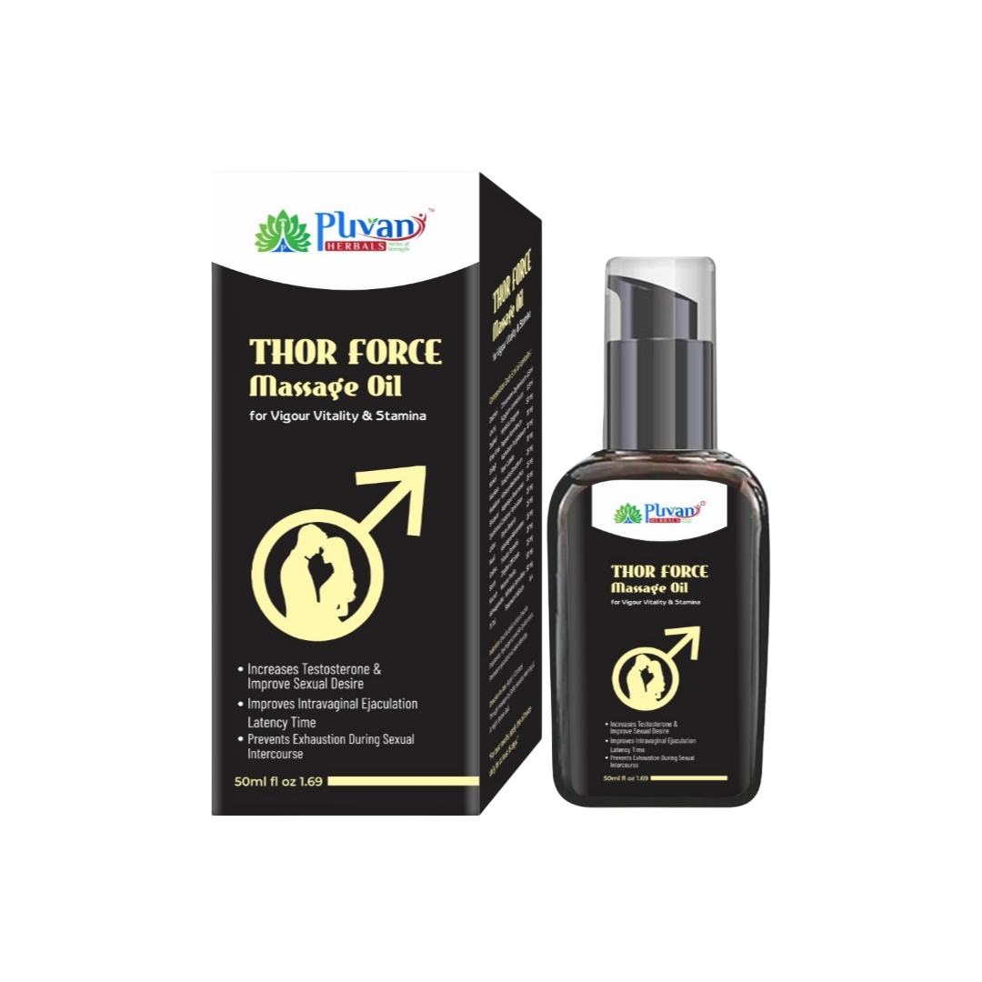 Puvan Herbals Thor Force Oil is a premium Ayurvedic Men power oil specially formulated to support male vitality, strength, and endurance. Made with a blend of 15+ powerful herbs, this Herbal massage oil for men is designed to nourish, energize, and promote long-lasting performance naturally.